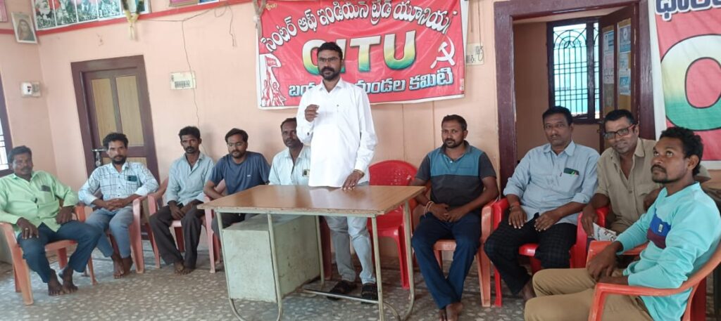 పరివర్తన ఆవాజ్ అక్టోబర్ 10 మహబూబాబాద్. బయ్యారం. గ్రామ పంచాయితీ సిబ్బందికి ఉద్యోగ భద్రతతో పాటు హక్కుల పరిరక్షణకై నిరంతరం పోరాడుతున్న తెలంగాణ గ్రామ పంచాయితీ ఎంప్లాయిస్ అండ్ వర్కర్స్ యూనియన్ (సీఐటీయూ) రాష్ట్ర 5వ మహాసభలు ఈనెల 24,25 తేదీల్లో జిల్లాలోని గార్ల మండల కేంద్రంలో జరుగనున్నాయని, మహాసభలను జయప్రదం చేయాలని సిఐటీయూ జిల్లా కార్యదర్శి, గ్రామ పంచాయితీ యూనియన్ జిల్లా గౌరవ అధ్యక్షులు కుంట ఉపేందర్ తెలిపారు. శుక్రవారం మండల కేంద్రంలోని వేజేళ్ళ సైదులురావు భవనంలో గ్రామ పంచాయితీ యూనియన్ మండల కమిటీ సమావేశం వెంకన్న అధ్యక్షతన జరిగింది. ఈ సమావేశంలో ఉపేందర్ మాట్లాడుతూ రాష్ట్రంలో పంచాయతీ కార్మికులు మల్టి పర్పస్ వర్కర్ విధానంతో చాలా ఇబ్బందులకు గురవుతున్నారని, నైపుణ్యం లేని పనులు చేయడం వల్ల అనేకమంది చనిపోతున్నారని ఆవేదన వ్యక్తం చేశారు. పెండింగ్ వేతనాలు ఇవ్వాలని, ఆదివారం, పండుగ సెలవులు ఇవ్వాలని, ఉద్యోగ భద్రత, మల్టీ పర్పస్ వర్కర్ విధానం రద్దు చేయాలని డిమాండ్ చేశారు. గ్రామ పంచాయితీ కార్మికులు వేతనాలు సకాలంలో అందక అవస్థలు పడుతున్నారని వివరించారు. రాష్ట్ర ప్రభుత్వం గ్రీన్ చానెల్ ద్వారా వేతనాలు చెల్లించాలని డిమాండ్ చేశారు. పంచాయితీ కార్మికులకు కనీస వేతనం 26 వేలతో పాటు వర్కర్లు ఎదుర్కొంటున్న పలు సమస్యల పరిష్కారానికి రాష్ట్ర ప్రభుత్వంపై ఒత్తిడి తెచ్చేలా రాష్ట్ర మహాసభల్లో చర్చించి తగిన కార్యాచరణ రూపోందిస్తామని, మహాసభల జయప్రదానికి గ్రామ పంచాయితీ సిబ్బందితో పాటు ఉద్యమ శ్రేయోభిలాషులు సహకరించి జయప్రదం చేయాలని కోరారు. ఈ సమావేశంలో సిఐటియు మండల కార్యదర్శి వల్లాల వెంకన్న గ్రామ పంచాయితీ యూనియన్ మండల నాయకులు అశోక్, ఆదిశేషులు, సర్వర్ పాషా, రమేష్, వెంకన్న, నరేష్, శ్రీకాంత్ తదితరులు పాల్గొన్నారు.