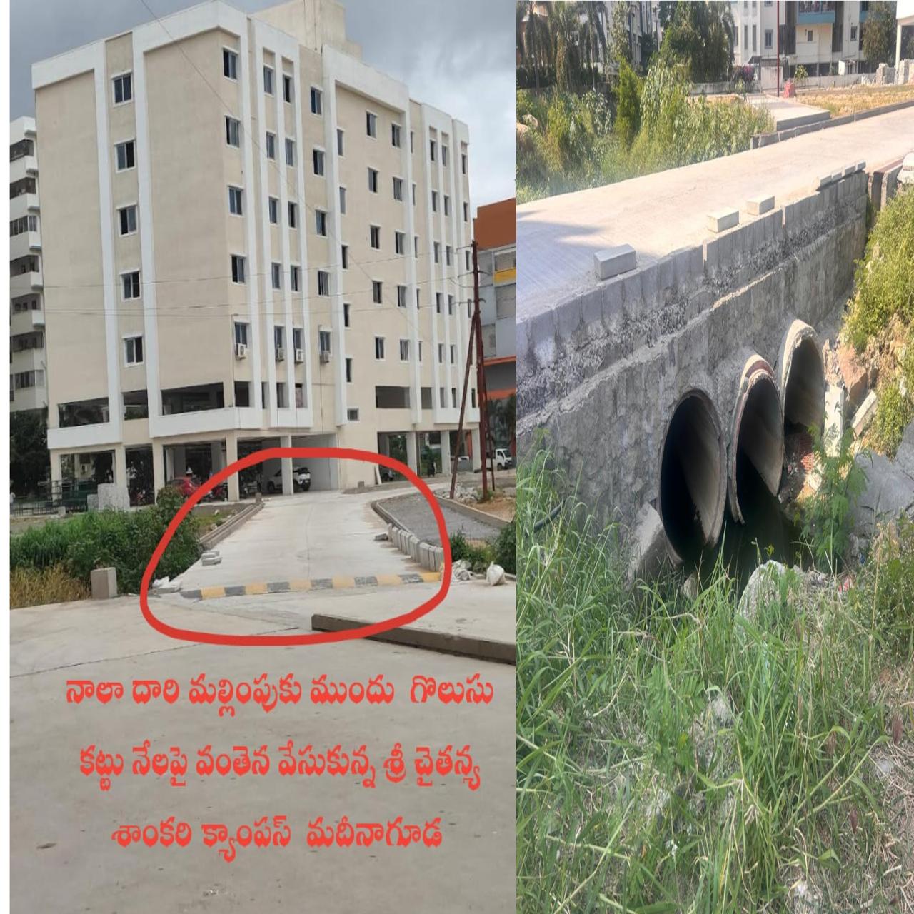 శేరిలింగంపల్లి, పరివర్తన అవాజ్ నవంబర్ 23 శేరిలింగంపల్లి నియోజకవర్గంలోని మాదినగూడ ప్రాంతంలో ఐదు ప్రధాన చెరువులను కలిపే అత్యంత కీలకమైన గొలుసుకట్టు నాలా ఆక్రమణ పెను సంచలనం సృష్టిస్తోంది. స్థానిక శ్రీ చైతన్య కళాశాల యాజమాన్యం ఎలాంటి అనుమతులు లేకుండానే, పట్టపగలు ఈ జీవనాలా రూపురేఖలు మార్చివేసి, దారి మళ్లించి, శాశ్వత బాక్స్ డ్రైన్ను నిర్మించినా, అడ్డుకోవాల్సిన ప్రభుత్వ మూడు శాఖల అధికారులు మాత్రం నిమ్మకు నీరెత్తినట్లు వ్యవహరిస్తున్నారూ అంతే కాకుండా నాలా కబ్జాపై స్థానికుల ఫిర్యాదు మేరకు ఇరిగేషన్ శాఖ అధికారులు నవంబర్ 14, 2025న తనిఖీ నిర్వహించి, శ్రీ చైతన్య యాజమాన్యం నాలాను ఆక్రమించి, మట్టి వ్యర్థాలతో పూడ్చివేసినట్లు ధృవీకరించారు. దీనిపై ఇరిగేషన్ శాఖ డిప్యూటీ ఎగ్జిక్యూటివ్ ఇంజనీర్ నవంబర్ 15న తక్షణ చర్యల కోసం జీహెచ్ఎంసీ సర్కిల్ 21 డిప్యూటీ కమిషనర్ మరియు శేరిలింగంపల్లి మండల తహసీల్దార్కు అధికారిక లేఖలు అందజేశారు.లేఖలో ఆక్రమణలపై సంబంధిత పోలీస్ స్టేషన్లో కేసు నమోదు చేసి, యాజమాన్యంపై చర్యలు తీసుకోవాలని మండల తహసిల్దార్ ని కోరడం జరిగిందని నాలాలో వ్యర్థాలు వేయడాన్ని నిలిపివేసి, అక్రమ నిర్మాణాలను తొలగించడానికి సర్కిల్ 21 డిప్యూటీ కమిషనర్ కు లేఖ రాసిన ఇరిగేషన్ అధికారులు ఈ ఆదేశాలన్నీ లోకాయుక్త ఇచ్చిన ఆదేశాల మేరకు తప్పనిసరని ఇరిగేషన్ అధికారులు స్పష్టం చేశారు.