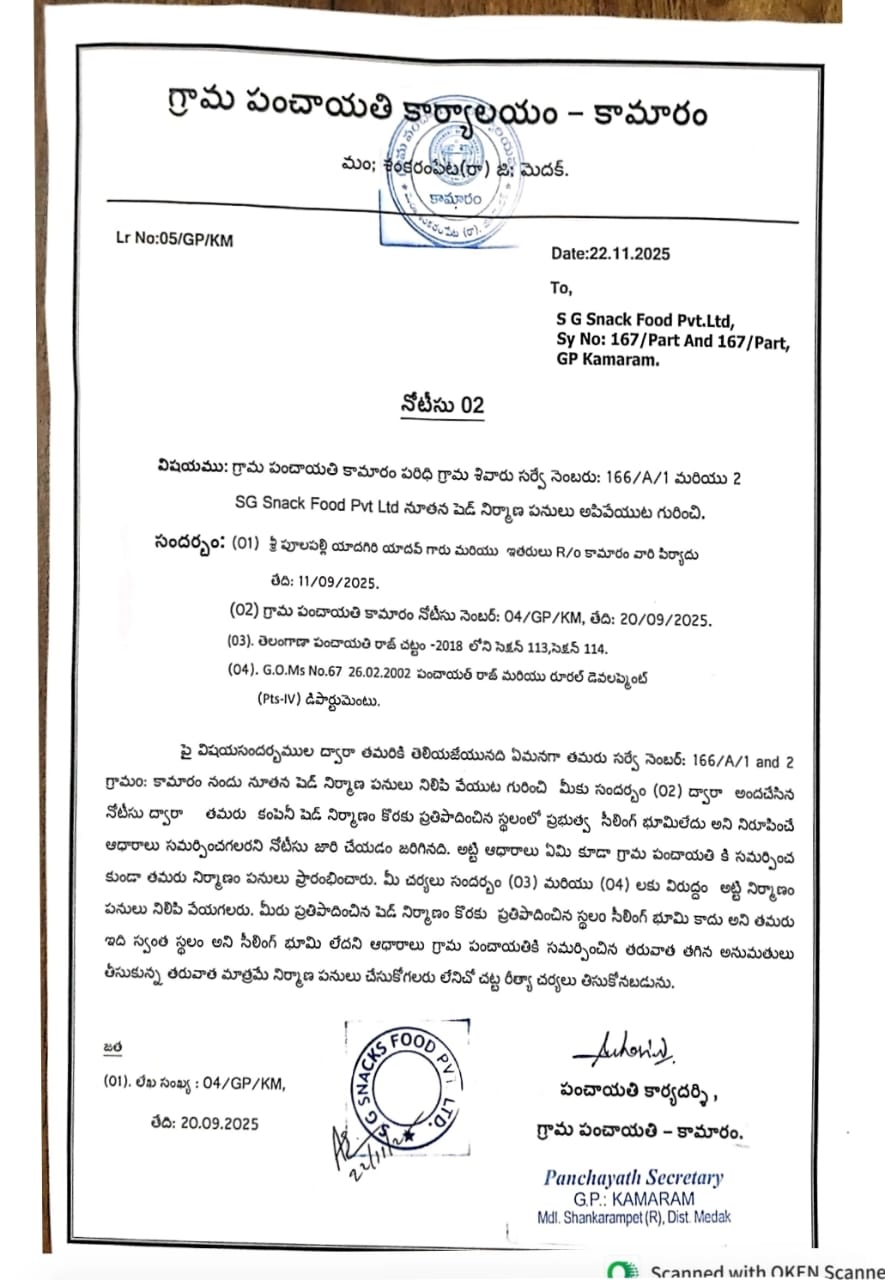 మెదక్ జిల్లా ప్రతినిది డిసెంబర్ 6 (పరివర్తన అవాజ్), పేదలు పూరి గుడిసె వేసుకోవడానికి, ఇల్లు నిర్మించుకోవడానికి ఒక గుంట భూమి ఇవ్వమంటే ఇవ్వడానికి నిరాకరిస్తున్న ప్రభుత్వాలు, స్థానిక అధికారులు.. కోట్లాది రూపాయల విలువ చేసే ప్రభుత్వ భూమిని మాత్రం వ్యాపారులకు కట్టబెడుతున్నారనే తీవ్ర ఆరోపణలు వెల్లువెత్తుతున్నాయి. ముఖ్యంగా, మెదక్ జిల్లా, చిన్న శంకరంపేట మండలం, కామారం పంచాయతీ పరిధిలో జరిగిన భూ కబ్జా వ్యవహారంలో అధికారులు వ్యవహరిస్తున్న తీరు ఇందుకు నిదర్శనంగా కనిపిస్తోంది. కామారం పంచాయతీ పరిధిలో గల 166 సర్వే నెంబర్లో ఉన్న సుమారు 0.39.5 గుంటల ప్రభుత్వ భూమిని ఎస్.జి. స్నాక్స్ ఫుడ్ ప్రైవేట్ లిమిటెడ్ అనే కంపెనీ అడ్డదారిలో రిజిస్ట్రేషన్ చేసుకున్నట్టుగా తెలుస్తుంది. రికార్డులలో ఉన్న పొరపాట్లను అదునుగా తీసుకుని, కంపెనీ యాజమాన్యం ఈ భూమిని రిజిస్ట్రేషన్ చేసుకొని, దానిలో యథేచ్ఛగా నిర్మాణాలను చేపడుతోంది.