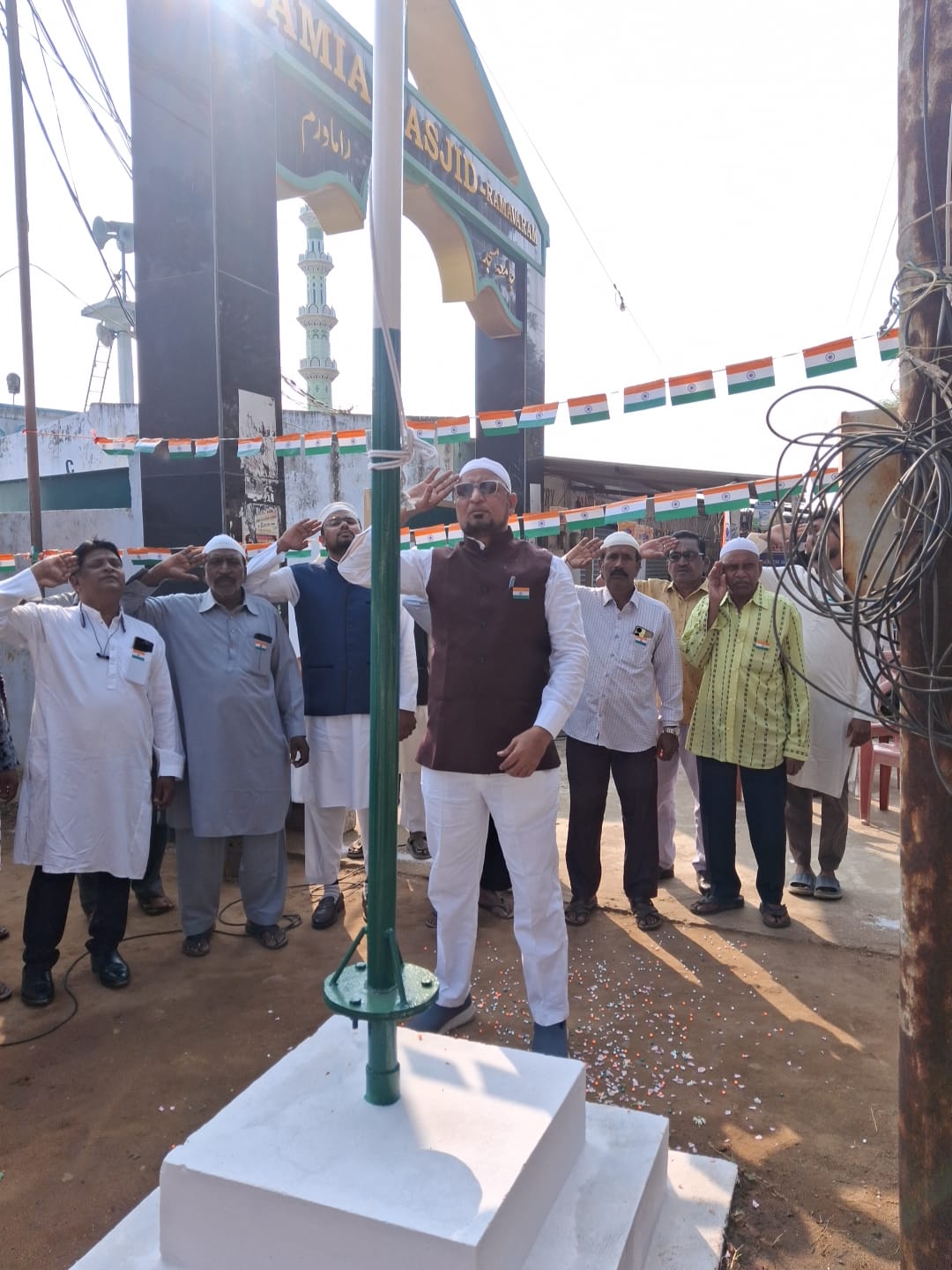 పరివర్తన అవాజ్,కొత్తగూడెం:-రామవరం జామియా మసీద్ ఆవరణలో 77వ గణతంత్ర దినోత్సవ వేడుకలు ఘనంగా నిర్వహించారు. ఈ కార్యక్రమానికి ముఖ్య అతిథిగా విచ్చేసిన రామవరం ప్రముఖ వస్త్ర వ్యాపారి సయ్యద్ అబ్దుల్ నజీర్ జాతీయ జెండాను ఎగురవేసి ప్రజలకు గణతంత్ర దినోత్సవ శుభాకాంక్షలు తెలిపారు. ఈ సందర్భంగా ఆయన కవిత రూపంలో యువతకు సందేశం ఇస్తూ మతసామరస్యం, పరమత సహనం పాటిస్తూ కులమత భేదాలను విడనాడి దేశ అభివృద్ధికి ఐక్యంగా కృషి చేయాలని పిలుపునిచ్చారు. అనంతరం శ్రీశ్రీ కళావేదిక తెలుగు అసోసియేషన్, ఆఫ్ నేషనల్ అకాడమీ బుక్ ఆఫ్ రికార్డ్స్ మరియు గోదావరి సోషల్ అండ్ కల్చరల్ అసోసియేషన్ సంయుక్త ఆధ్వర్యంలో అక్షర ప్రవీణ జాతీయ ప్రతిభా పురస్కారం అందుకున్న సయ్యద్ అబ్దుల్ నజీర్ను ఘనంగా సన్మానించారు. ఈ కార్యక్రమంలో జామియా మసీద్ సదర్ కమిటీ సభ్యులు, పురప్రముఖులు పాల్గొన్నారు.